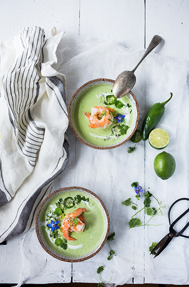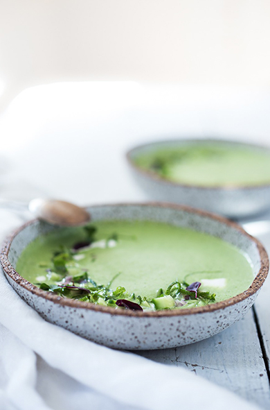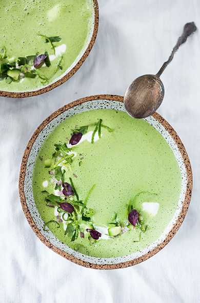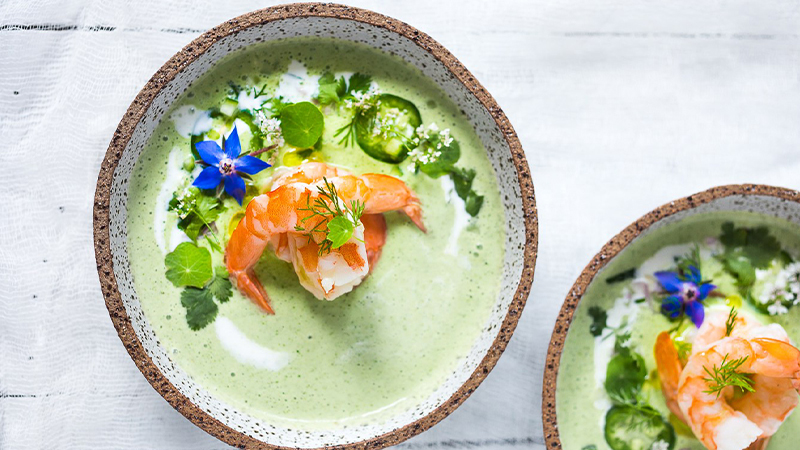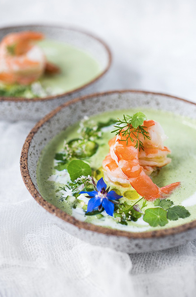 - 用湯匙慢慢於湯面上淋上加了水的酸奶油,最後逐一放上青瓜、紅蔥頭及食用花作裝飾