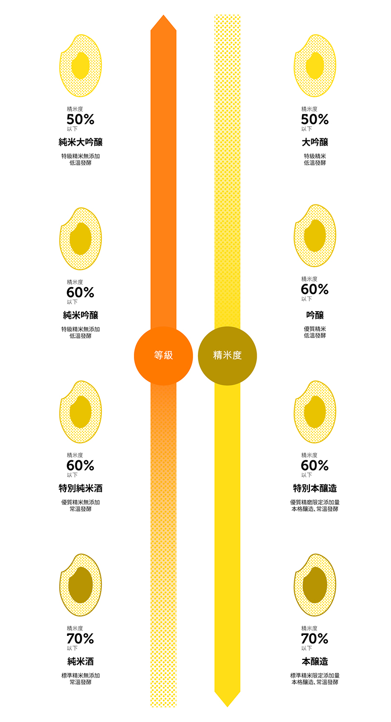 日本清酒的等級,取決於精米度。由於清酒是用米而釀成的,所以米打磨得越精細,釀出來的酒就被譽為越優質,價錢相對地就越貴。