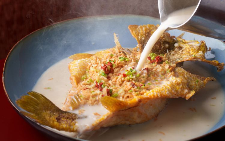 The Clay pot fried rice with yellow croaker, dried shrimp and aged tangerine peel features fragrant wok-tossed rice studded with crispy yellow croaker, briny dried shrimp and aromatic peel. When finished in a clay pot, the rice develops a golden, crunchy crust that adds irresistible texture and enticing aroma.