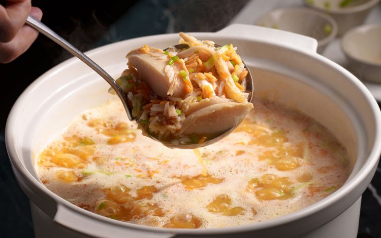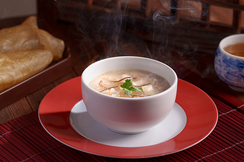 Elevate your dining experience with a touch of indulgence, the Double-boiled bird's nest soup with fish maw and twelve-year tangerine peel offers a delicate creation featuring rich chicken broth simmered with aged tangerine peel, silky minced chicken, luxurious collagen-rich fish maw and delicate bird's nest. The twelve-year tangerine peel imparts a woody warmth that perfectly harmonizes with the broth's umami richness.