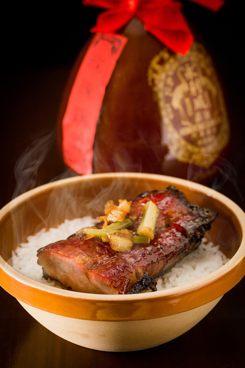 For a dramatic dining experience, the Flambé Rose Wine Barbecued Pork*, Lard Rice (HK$188 per person, minimum of four guests) is presented with a flourish. The tender pork is marinated with honey, rose wine, soy sauce and various ingredients for optimal texture and taste. The highlight of the dish is the chef's live performance, where flaming rose wine is poured over the barbecued pork, filling the room with the delicious aroma of rose wine and slightly charred barbecued pork. The dish is served with fragrant rice that guests can enhance by mixing in specially prepared lard and soy sauce. The lard is specially cooked with ginger, red onion and spring onion which elevates the taste when mixed with rice.